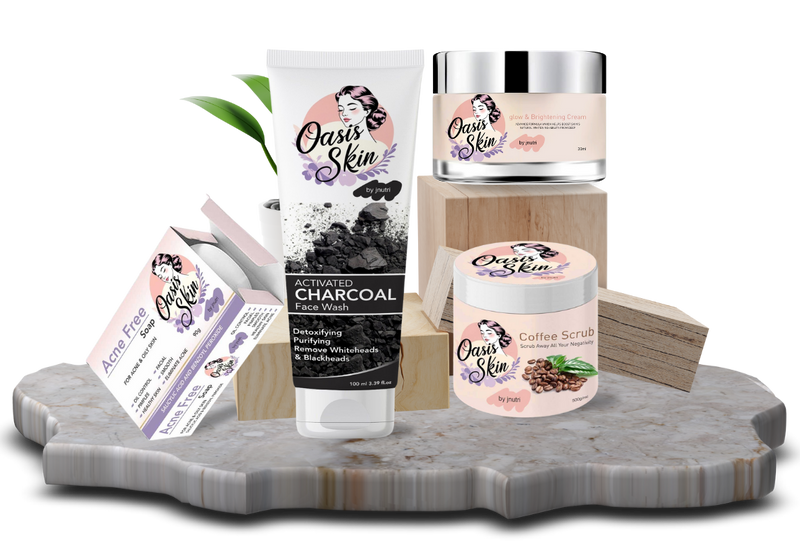 Glow & Brightening Cream, Acne Control Soap, Coffee Scrub, and Activated Charcoal Facewash. Natural ingredients, Dermatologist-approved, Suitable for all skin types.